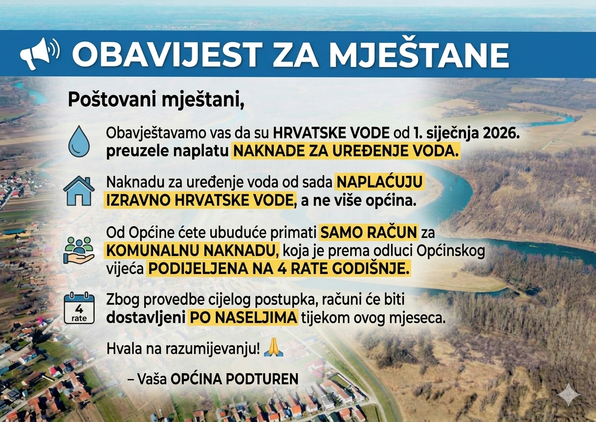 Poštovani, obavještavamo vas da su Hrvatske vode od 1. siječnja 2026. preuzele naplatu naknade za uređenje voda. Naknadu za uređenje voda od sada naplaćuju izravno Hrvatske vode, a ne više općina. Od Općine Podturen ćete ubuduće primati samo račun za komunalnu naknadu koja je prema odluci Općinskog vijeća podijeljena na 4 rate godišnje. Zbog provedbe cijelog postupka, računi će biti dostavljeni po selima tijekom ovog mjeseca. Hvala na razumijevanju!